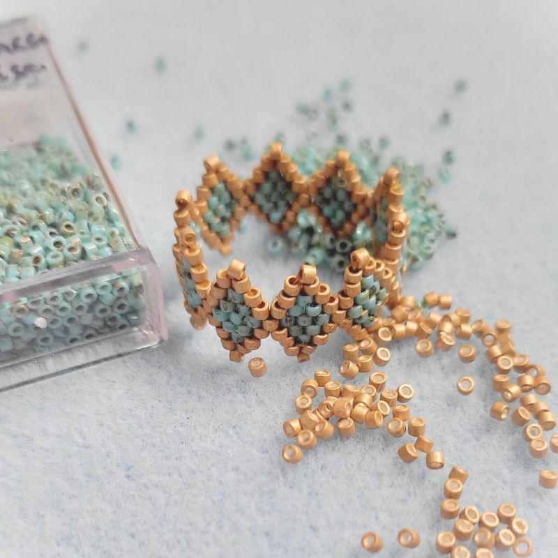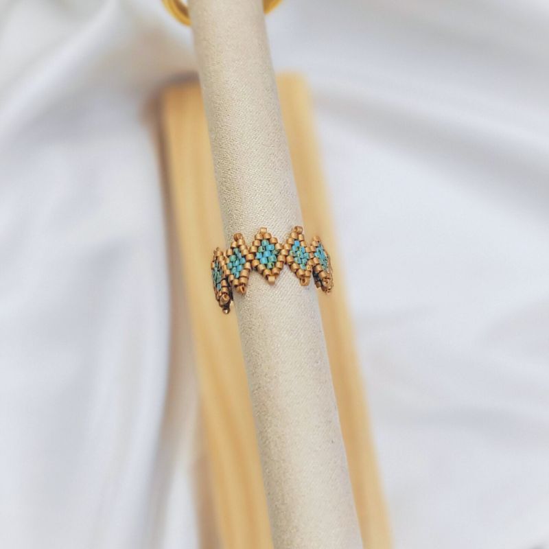 Voici une bague qui ne passe pas inaperçue. Tissée à la main avec de délicates perles japonaises, elle dessine une forme de couronne élégante et affirmée. Les reflets dorés se mêlent aux nuances turquoise pour créer un contraste lumineux, parfait pour apporter une touche bohème et solaire à chaque journée.